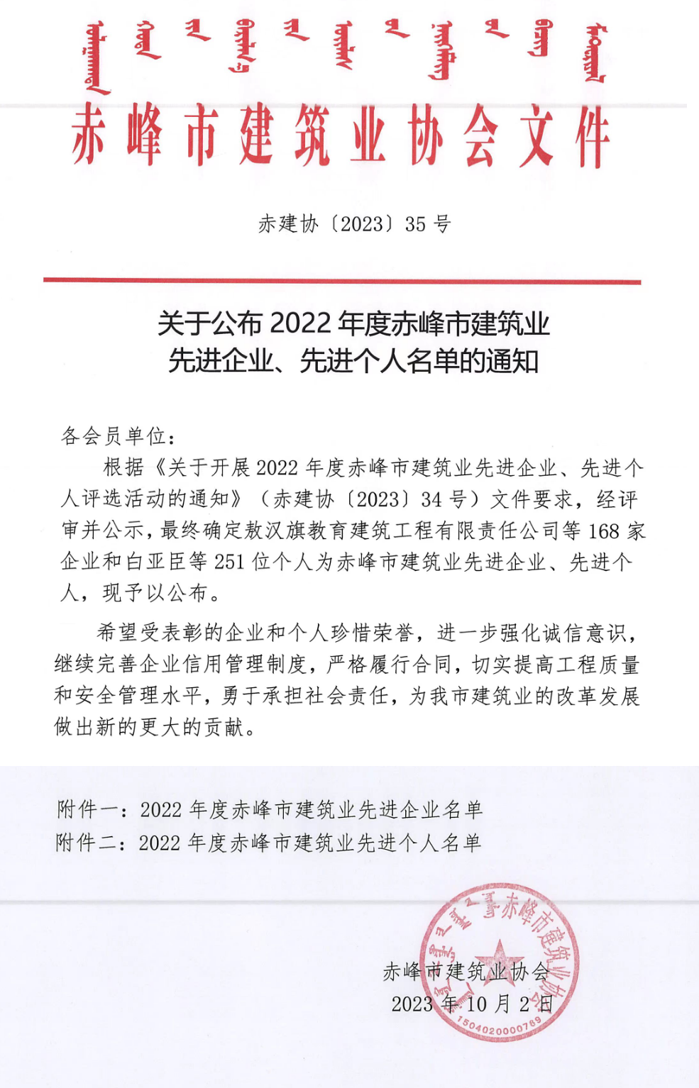 根據(jù)《關(guān)于開(kāi)展2022年度赤峰市建筑業(yè)先進(jìn)企業(yè)、先進(jìn)個(gè)人評(píng)選活動(dòng)的通知》(赤建協(xié)(2023)34號(hào))文件要求,經(jīng)評(píng)審并公示,最終確定中環(huán)恒灃建設(shè)有限公司為赤峰市建筑業(yè)先進(jìn)施工企業(yè)、質(zhì)量管理先進(jìn)企業(yè)和安全生產(chǎn)先進(jìn)企業(yè)。中環(huán)恒灃建設(shè)有限公司張曉茹、趙新朝、徐曉麗和王道軍為先進(jìn)個(gè)人。