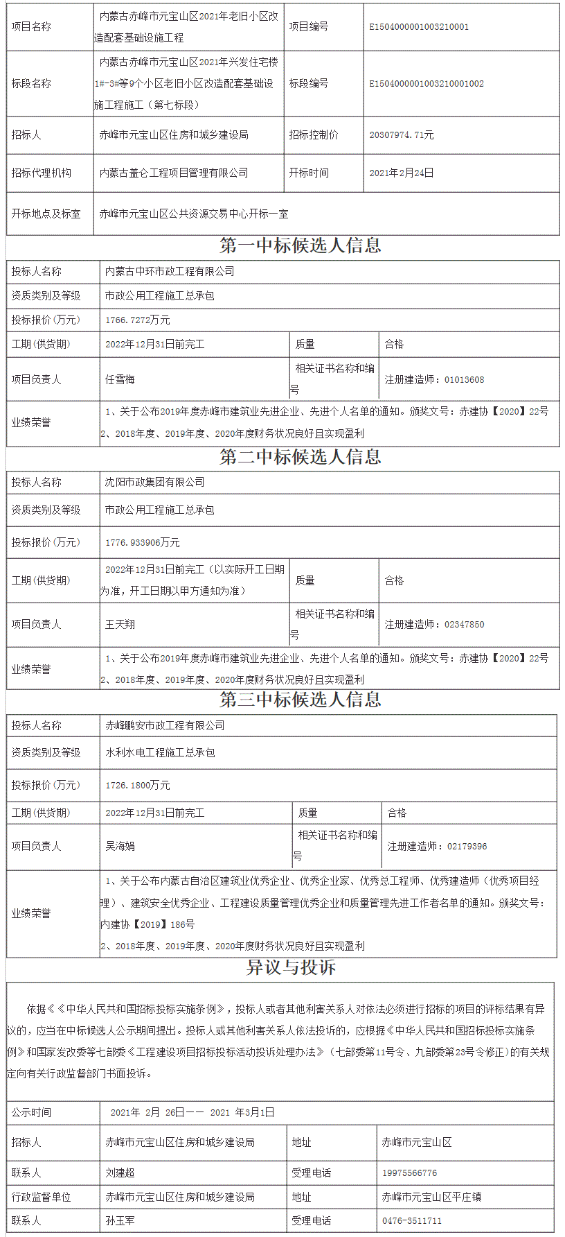 •       內(nèi)蒙古赤峰市元寶山區(qū)2021年興發(fā)住宅樓1#-3#等9個(gè)小區(qū)老舊小區(qū)改造配套基礎(chǔ)設(shè)施工程施工(第七標(biāo)段)招標(biāo)評(píng)標(biāo)工作已結(jié)束,依據(jù)評(píng)標(biāo)委員會(huì)的評(píng)標(biāo)報(bào)告,發(fā)布中標(biāo)候選人公示如下:
